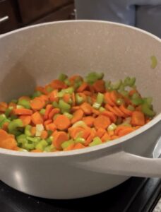 Add the chopped carrots, celery, cucumber, and half of the peppers. Sauté for about 5–7 minutes to soften slightly but still keep some crunch.