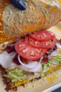 Spread peppercorn mayo on both zucchini cheese “slices.” Start layering your sandwich with smoked turkey, beef bacon, shredded lettuce, tomato slices, and red onion rings.