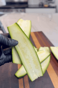 Using a mandoline or sharp knife, slice the zucchini lengthwise into thin strips. Place them on a paper towel and pat dry thoroughly to reduce moisture — this helps get that crispy finish.