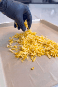 Preheat your oven to 400°F. Line a baking sheet with parchment paper. Sprinkle half of the shredded cheese into a rectangular shape (about the size of a sandwich slice). Layer the zucchini slices in a shingle-style overlap across the cheese rectangle. Sprinkle with garlic powder and smoked paprika (if using).