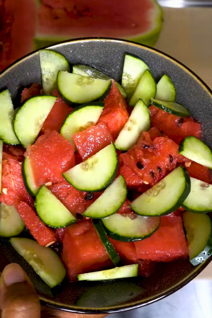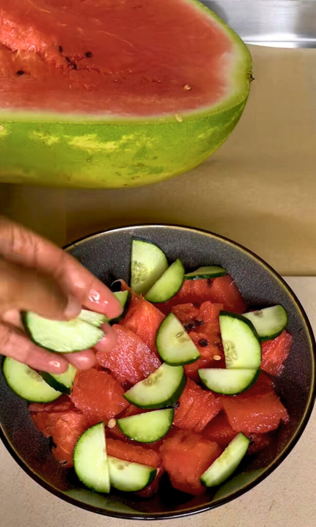 1. In a large mixing bowl, add the watermelon and cucumber.