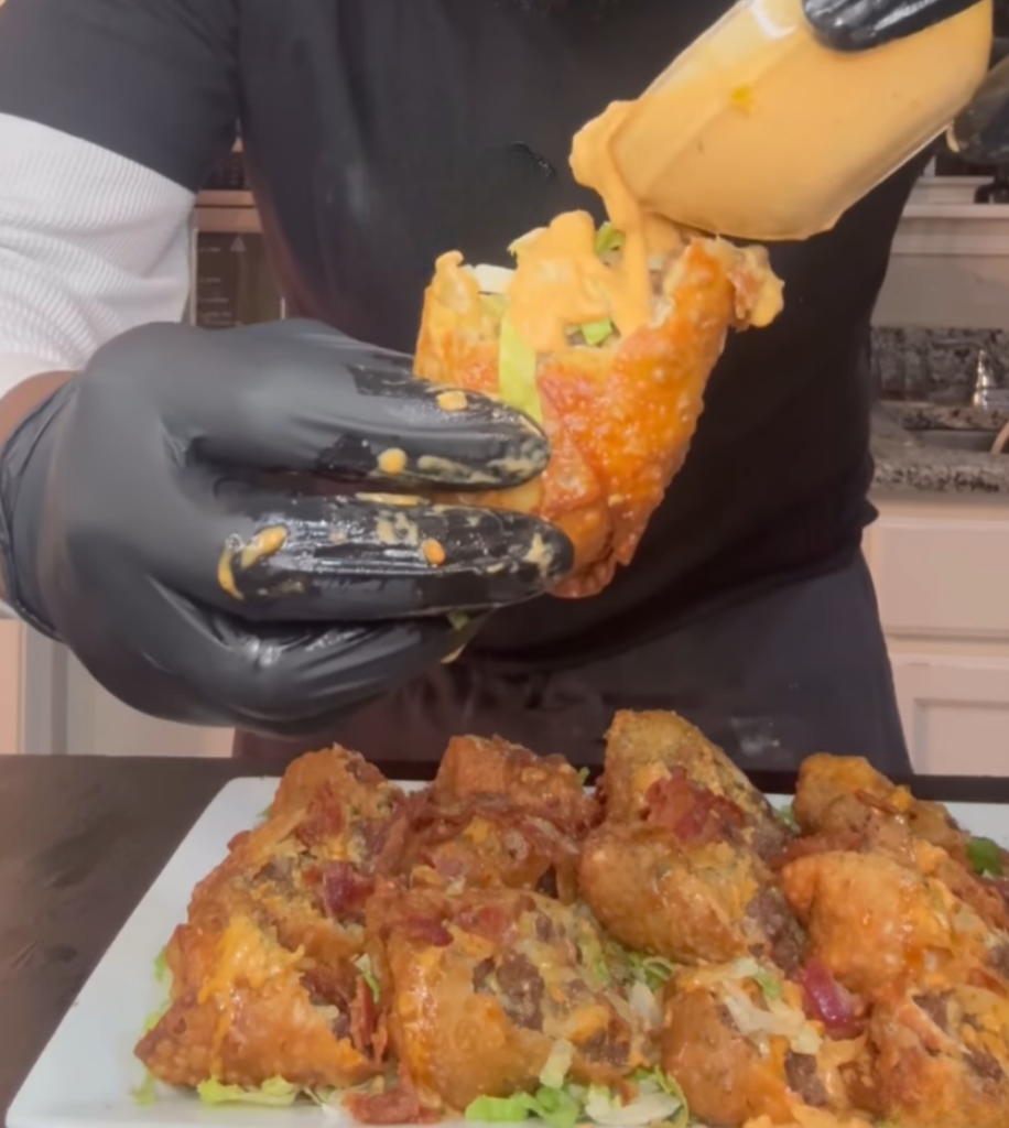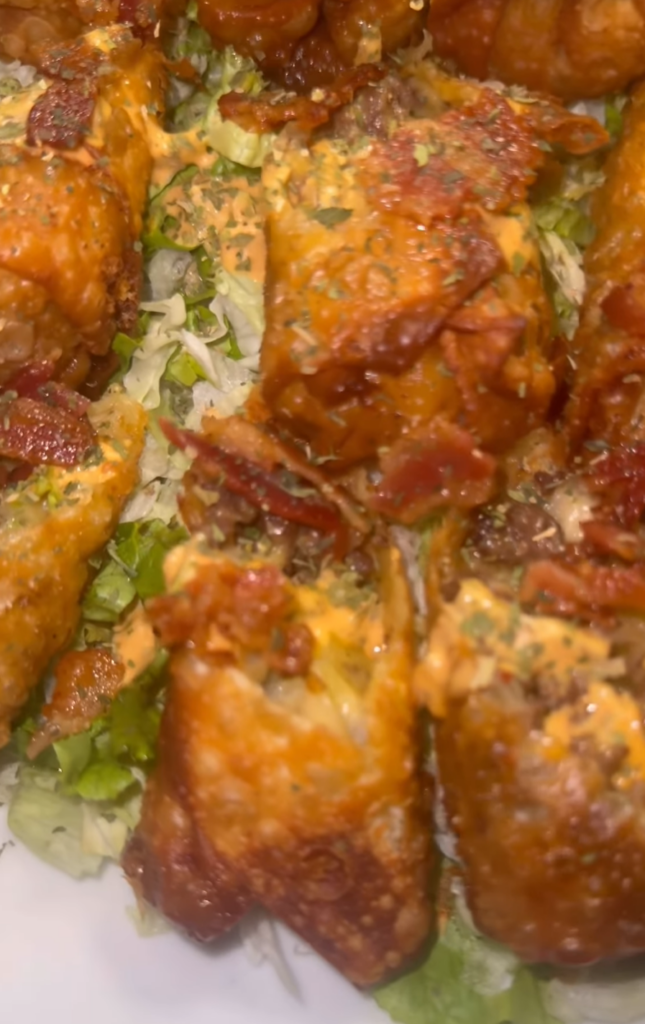 Brought to you by @smoakrichva1, these rolls are not for the shy. They’re packed with juicy ground beef, layers of melted American cheese, air-fried crispy bacon, and topped off with house-made mac sauce. Whether you’re looking for a party starter, late-night snack, or the most fire appetizer for your next get-together, this is a must-try, no-cap kind of dish.