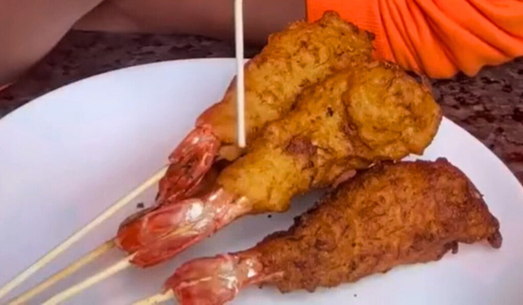 - Dip each skewered shrimp into the hushpuppy crab batter, ensuring a full, even coating.