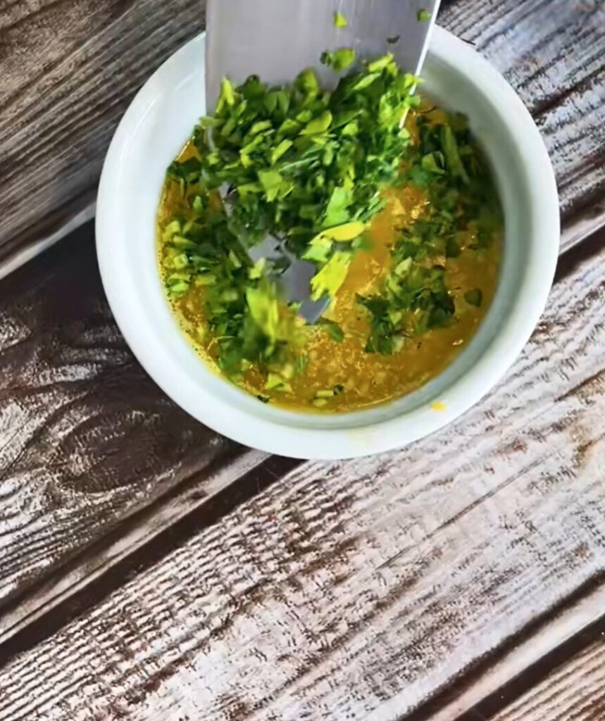 - While the pizza bombs are baking, add butter, minced garlic, chopped parsley, and parmesan to a small oven-safe bowl or pan.