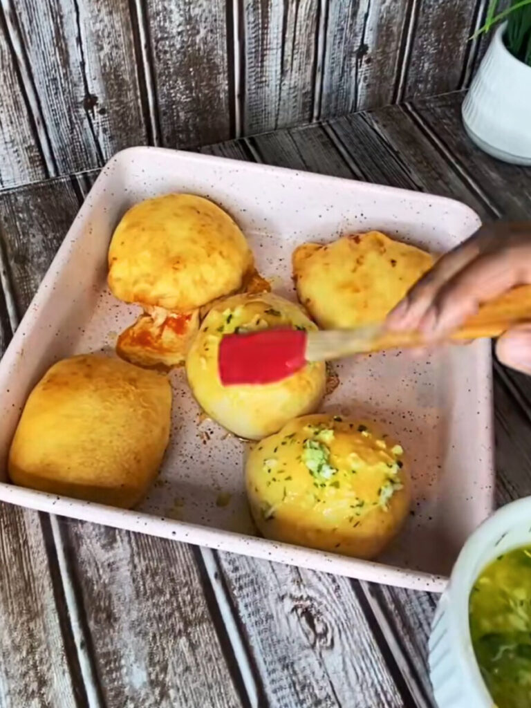 - As soon as the pizza bombs come out of the oven, brush them generously with the garlic parmesan butter.
