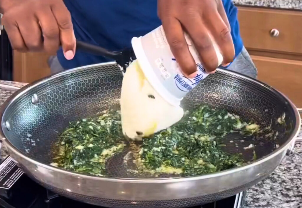 - In a skillet over medium heat, cook the chopped spinach until wilted.