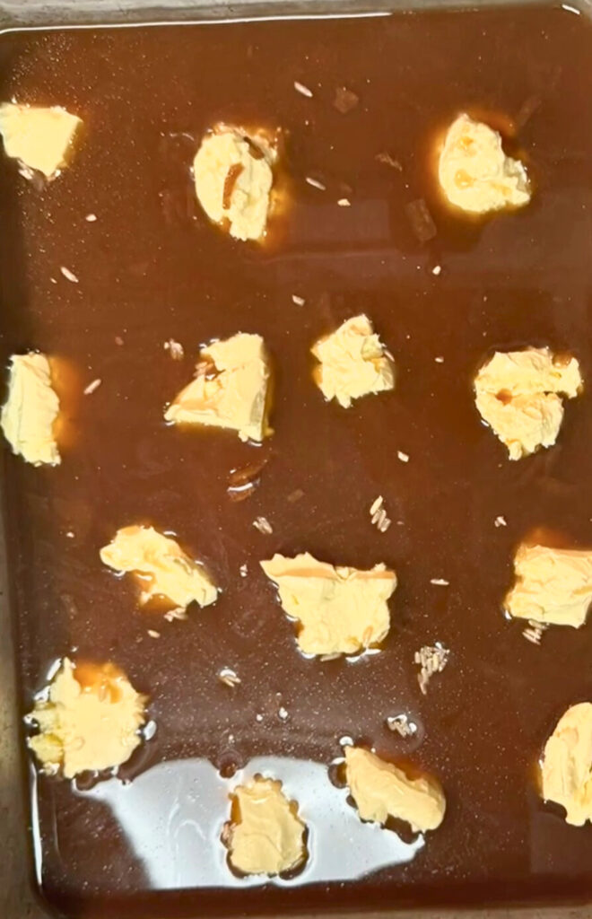 - Slice the butter into even pieces and scatter them on top of the rice mixture.