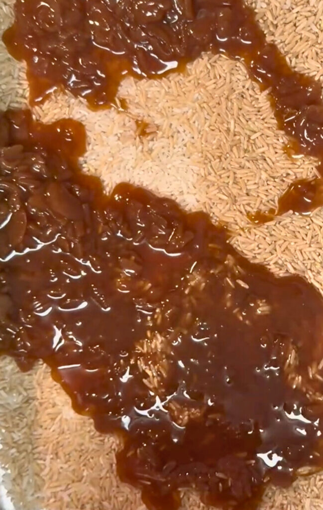 - In a 9×13 baking dish, combine the rice, beef broth, and French onion soup. Stir well to distribute the flavors.