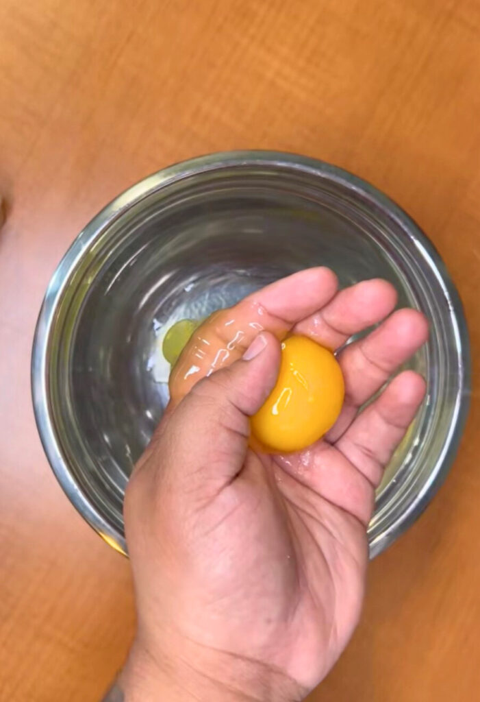 - Separate the egg yolk from the whites using a simple trick: let the egg whites fall between your fingers while carefully keeping the yolk intact.