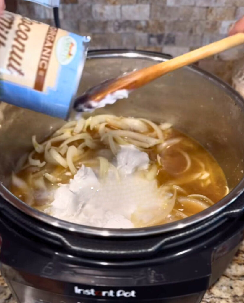 - Pour in the coconut milk, beef broth, fish sauce, brown sugar, and lime juice. Stir to combine.