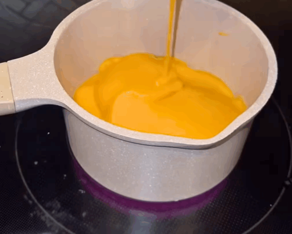 - In a saucepan, heat 2 cans of nacho cheese over low heat.