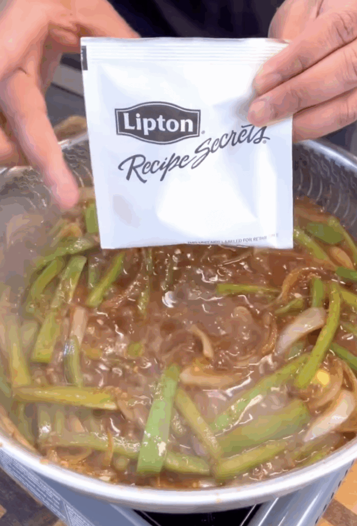 - Stir in the Lipton soup packet and flour, then gradually add beef broth, whisking to create a smooth gravy.