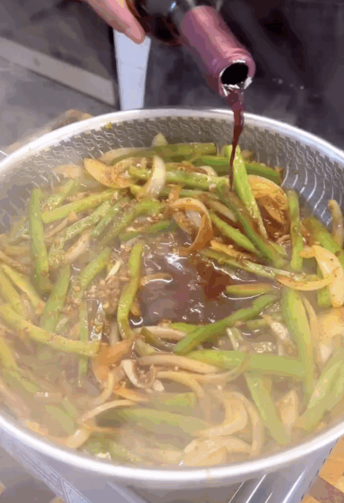 - In the same pan, add onions, bell pepper, and garlic.