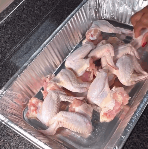 - Lay the wings flat and spaced out in a baking pan.