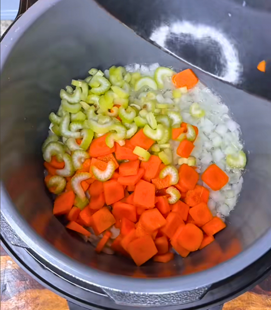 - Add diced onion, sliced celery, roughly cut carrots, and garlic cloves to the pot.