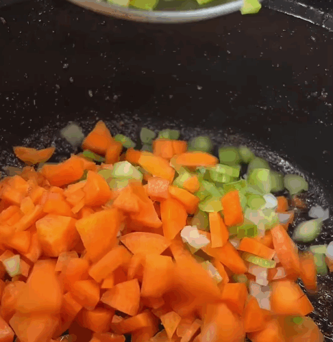 - Add onion, garlic, carrots, celery, and sun-dried tomatoes to the pot.