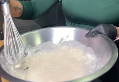 - Keep adding liquid until you achieve a thick, pancake-like batter consistency