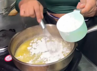 - Once melted, slowly whisk in 1 cup flour to create a roux