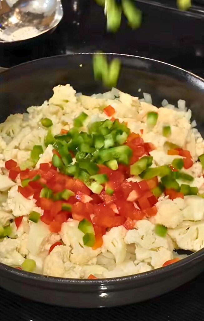 - Add the chopped cauliflower and sliced bell peppers to the skillet.