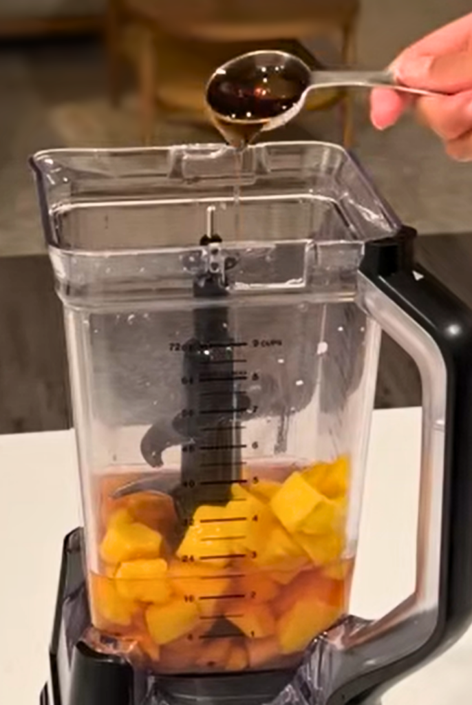 - Add frozen mango, coconut water, lime juice, and agave syrup.