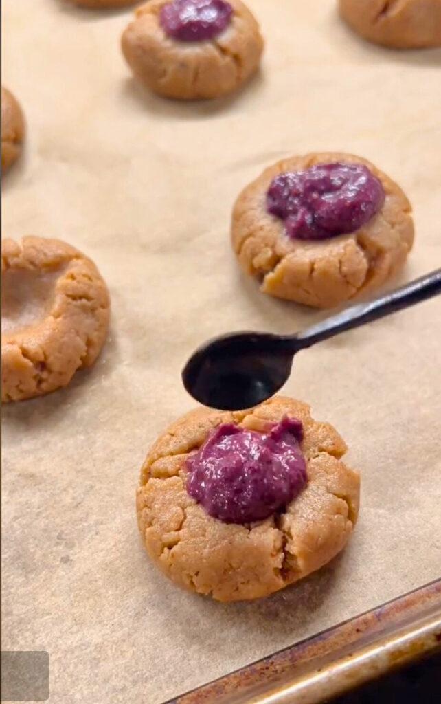 - Use your thumb or a small spoon to press gently into the center of each ball, creating space for the jam.