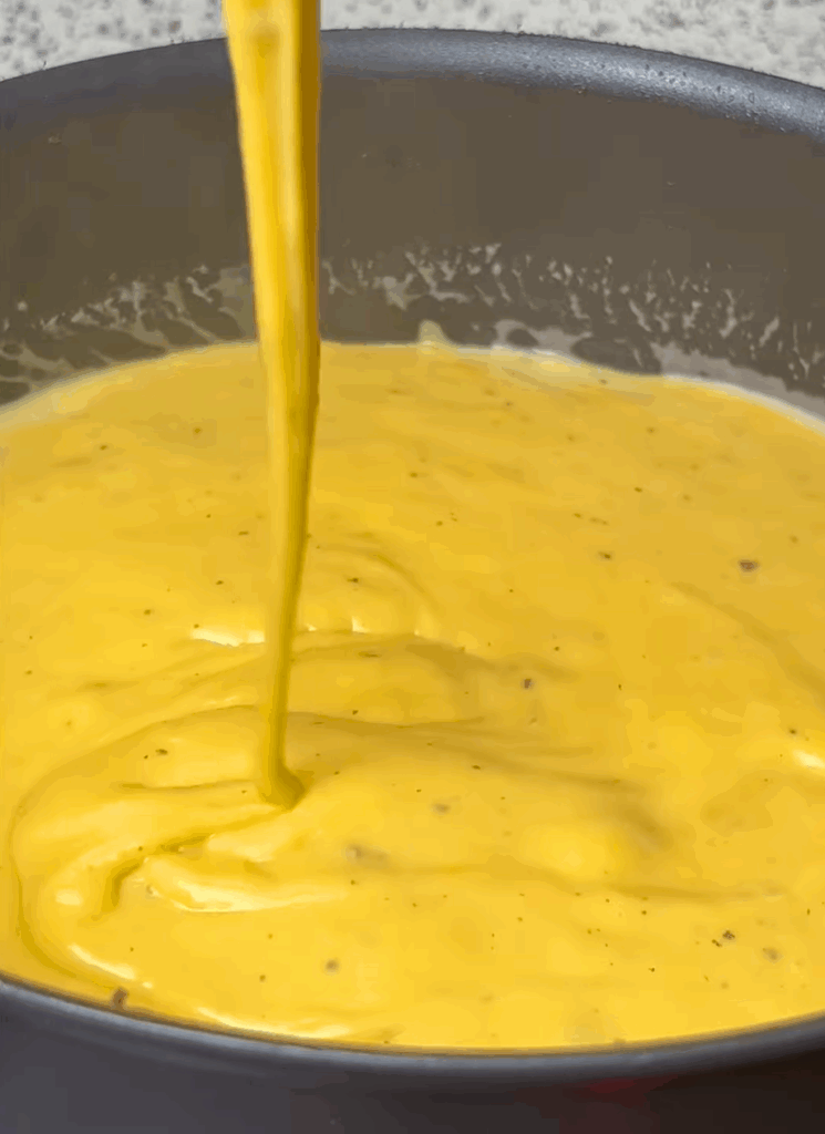 - Stir in coconut milk and plant-based cheese. Whisk until smooth and creamy.