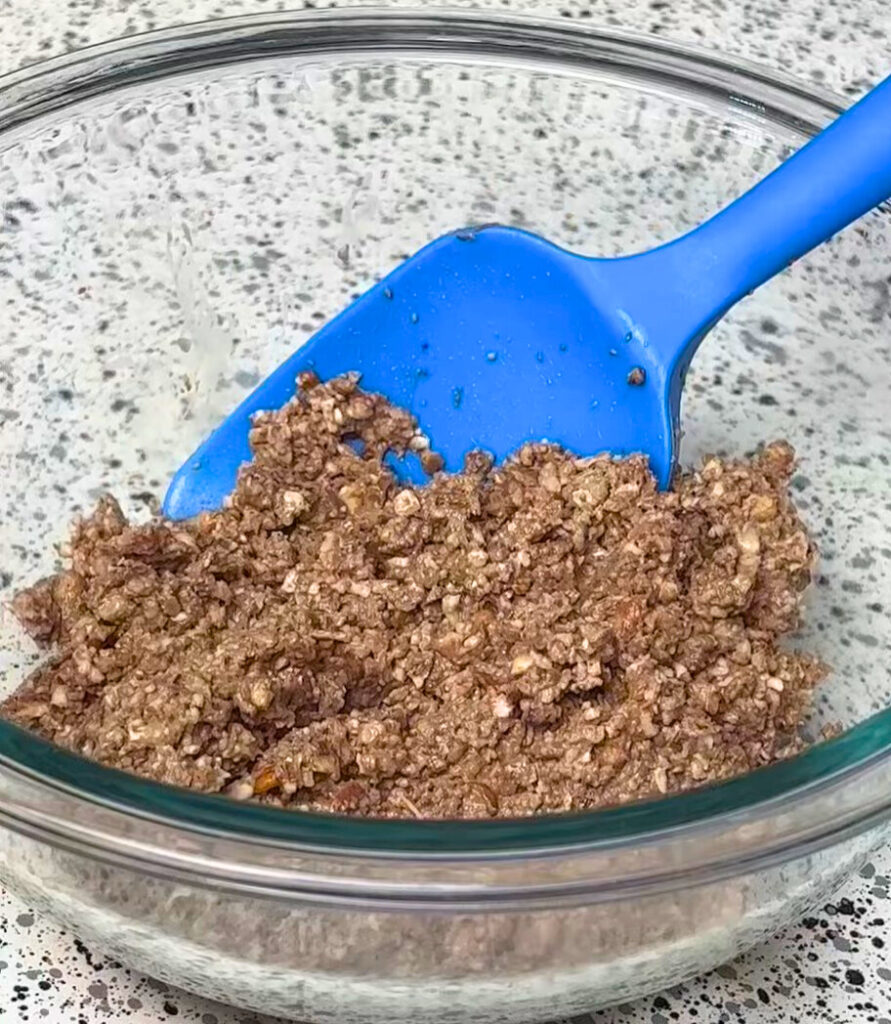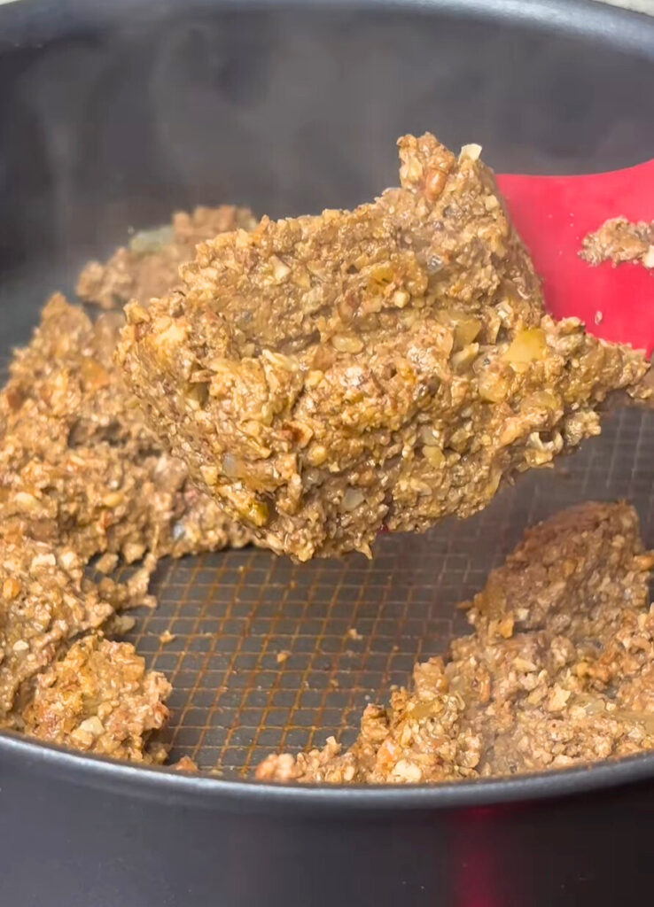 - Stir until fully combined, then fold in a portion of the seasoned pecan “meat.”