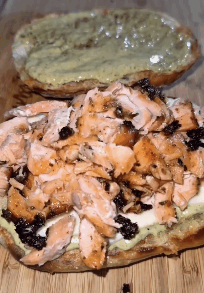 - Toast bread, spread pesto mayo, add salmon, mozzarella, tomato topping, and greens if desired.