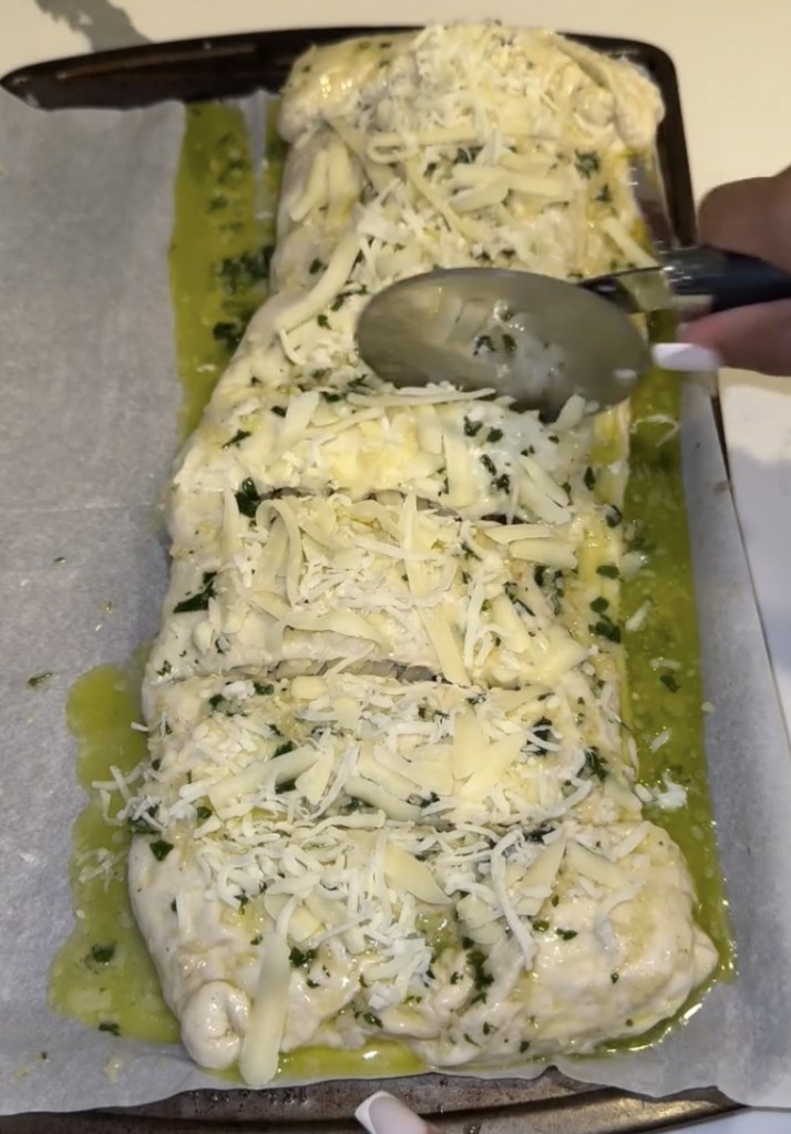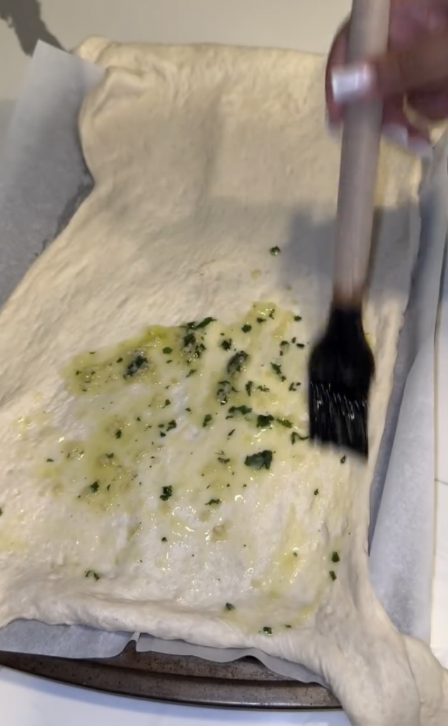 • Brush with remaining garlic butter and mozzarella, then slice into strips with a pizza cutter.