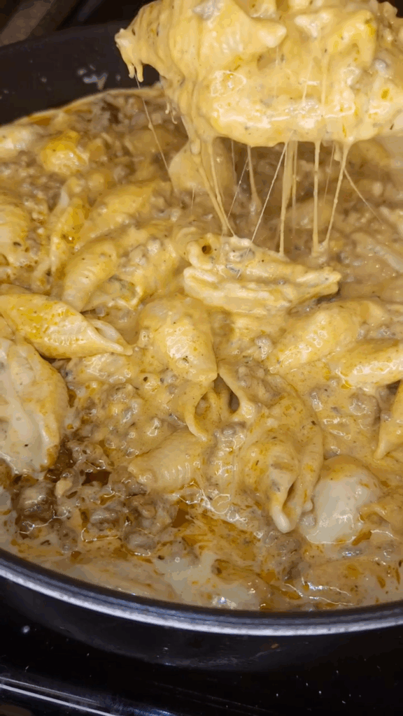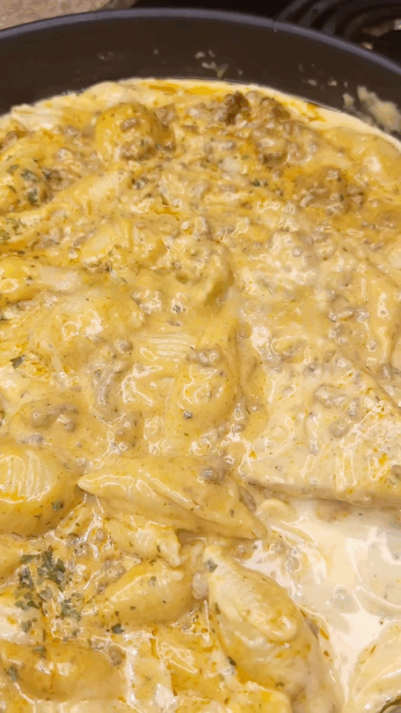 Add the cooked pasta shells to the skillet and gently fold them into the sauce and beef mixture. Mix until the pasta is thoroughly coated with the creamy, cheesy goodness.
