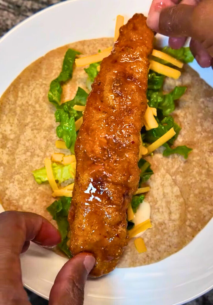 • Add shredded lettuce, cheese (if using), and a few fried catfish strips.