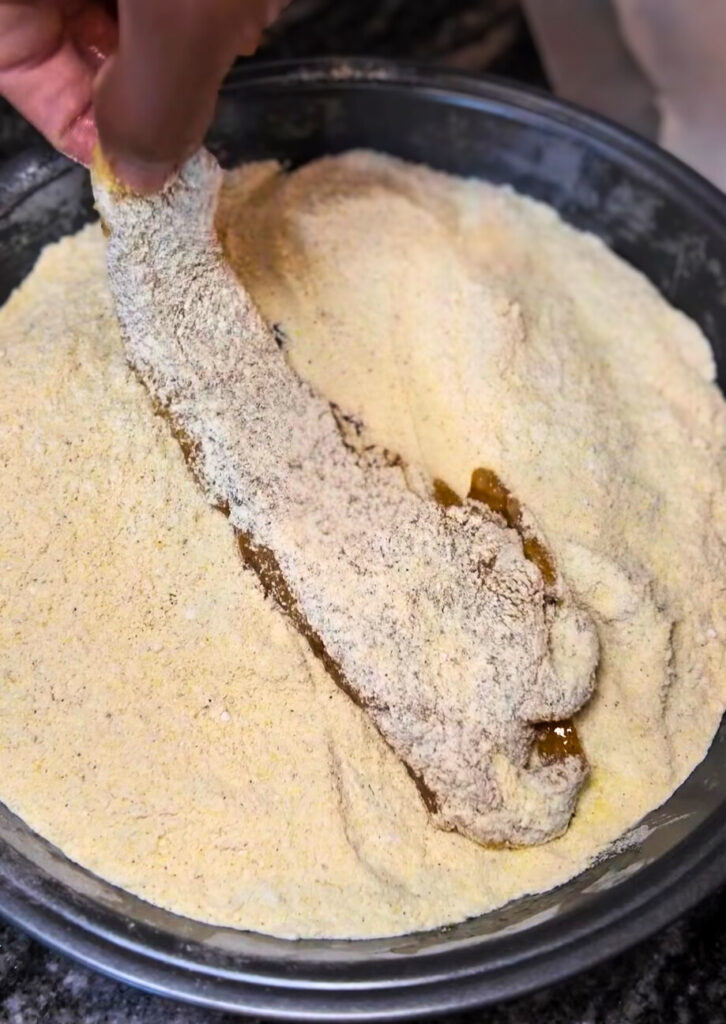 • In a separate bowl, mix cornmeal, flour, and the same seasonings used in the wet batter.