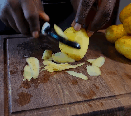 - Peel and cut the Yukon Gold potatoes into 2-inch chunks.