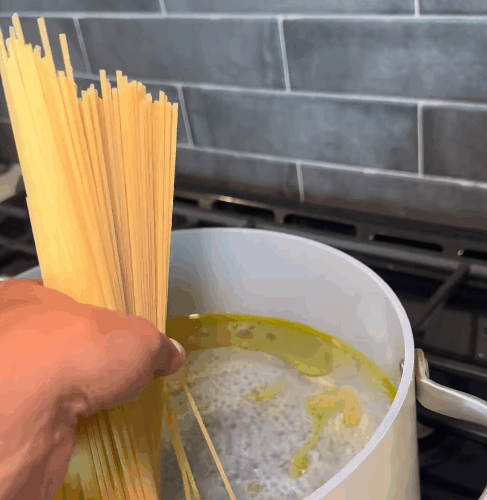 Cook spaghetti in salted water until al dente, then reserve ½ cup pasta water before draining.