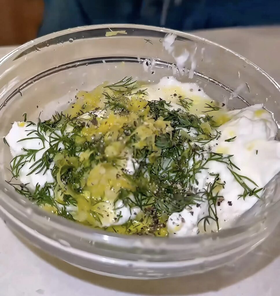 - In a bowl, combine Greek yogurt, garlic, lemon zest, lemon juice, and olive oil.