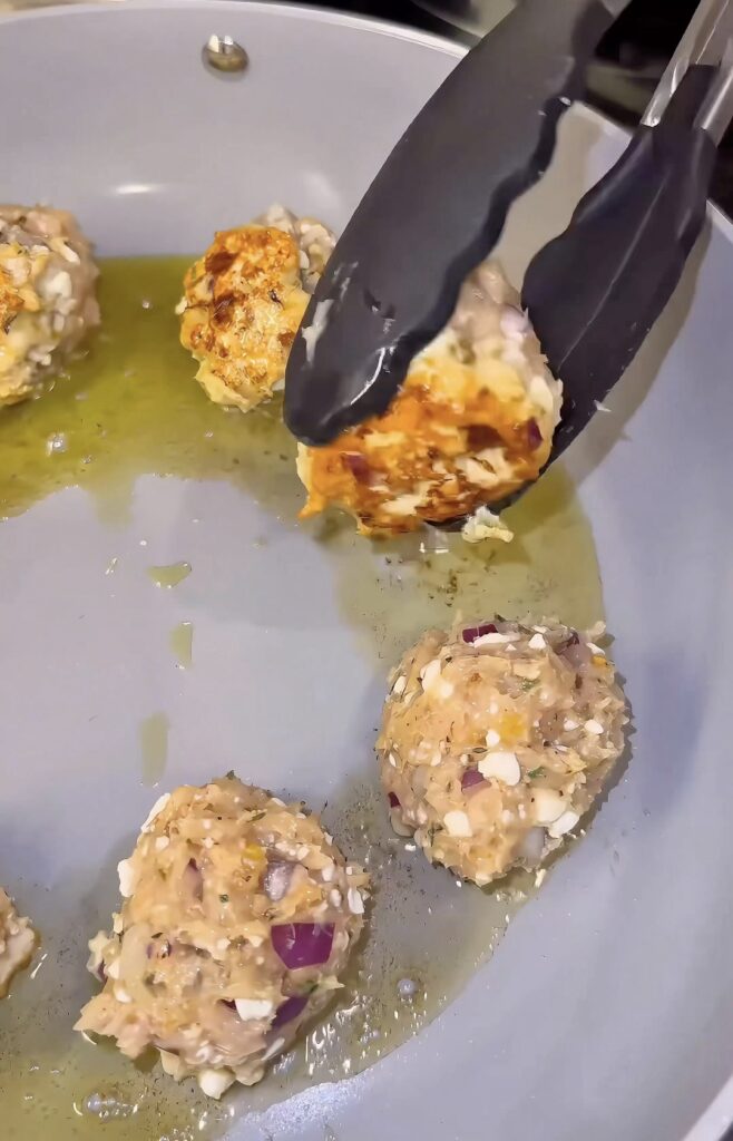 - Heat a skillet over medium heat with avocado oil. Sear meatballs on all sides until golden brown.