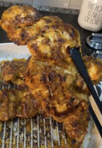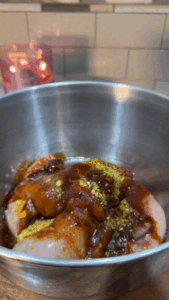 In a large bowl, add the chicken thighs along with oil, garlic paste, and adobo sauce. Sprinkle in all the seasonings: rotisserie chicken, Kinder’s blends, Tony’s Creole, paprika, Sazon Tropical, and chili powder. Massage the mixture into the chicken thoroughly.