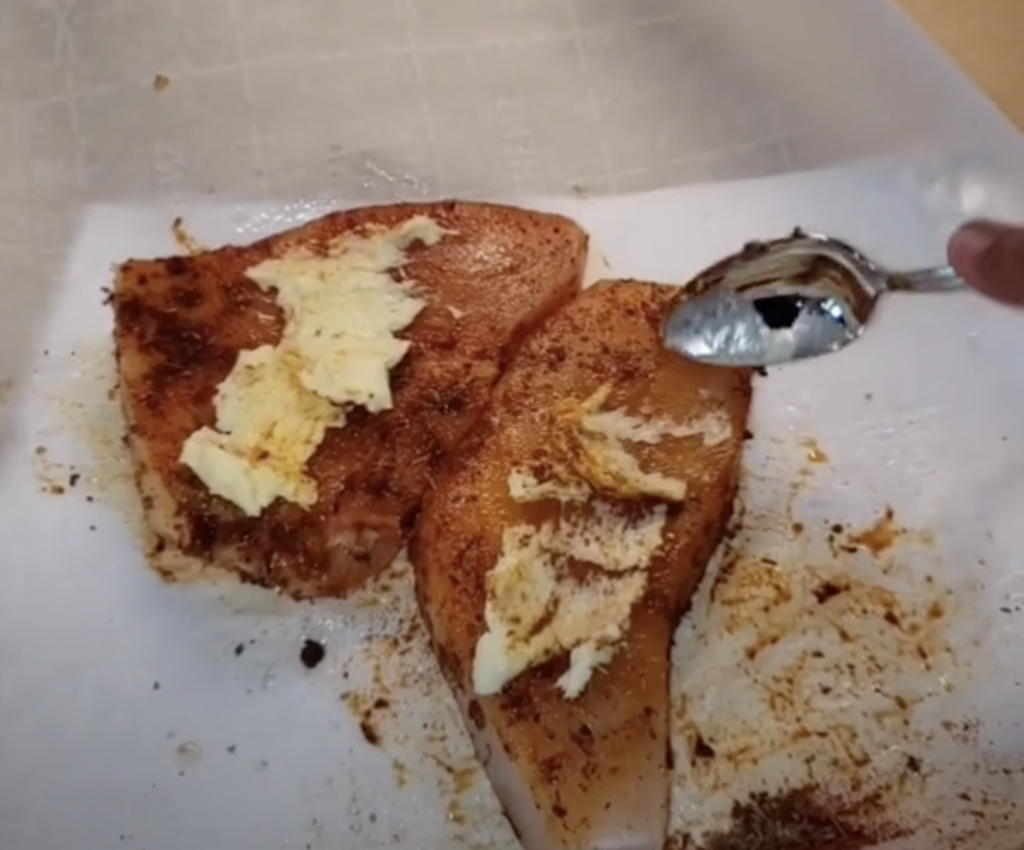 Take the homemade butter and slather it over the top of the fish. This step locks in moisture and creates a rich, buttery crust while broiling.
