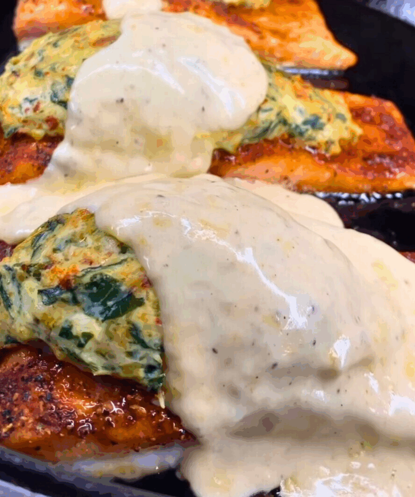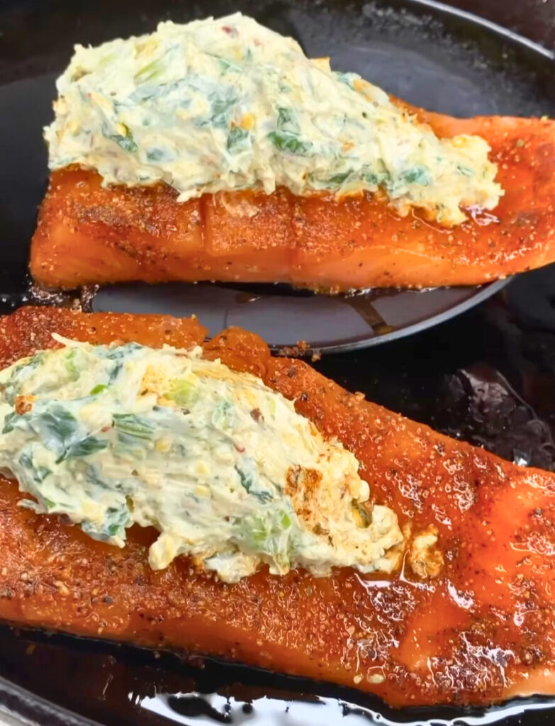 Turn your dinner into a gourmet moment with this Creamy Stuffed Blackened Salmon. Each salmon fillet is loaded with a decadent mix of cream cheese, Parmesan, and sautéed spinach, then broiled to perfection and finished with a velvety garlic cream sauce. Packed with flavor and layered with spice, this dish is made to impress—without the restaurant price tag.
