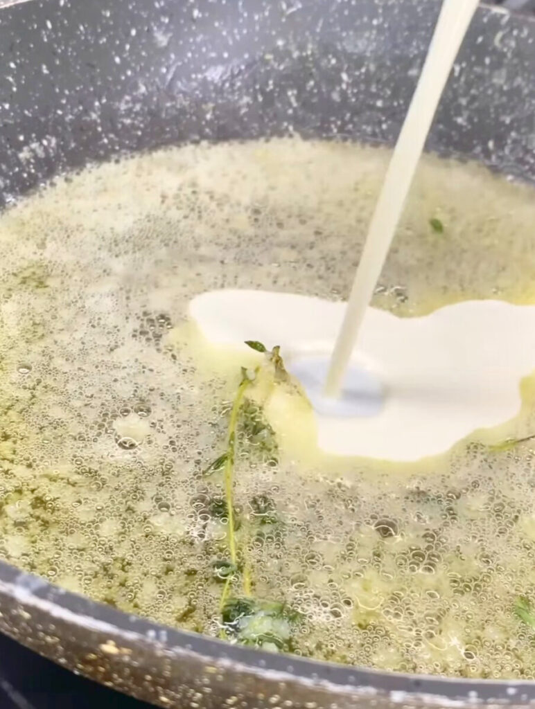 - Add garlic paste and thyme sprig, sauté until fragrant.