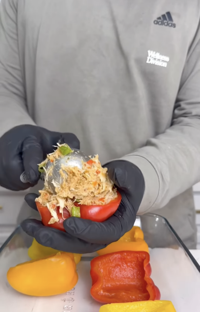 - Generously stuff each parboiled bell pepper half with the seafood filling.