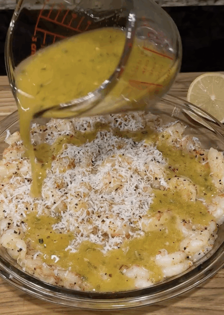 - Sprinkle a thin layer of Parmesan over the shrimp