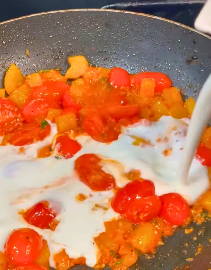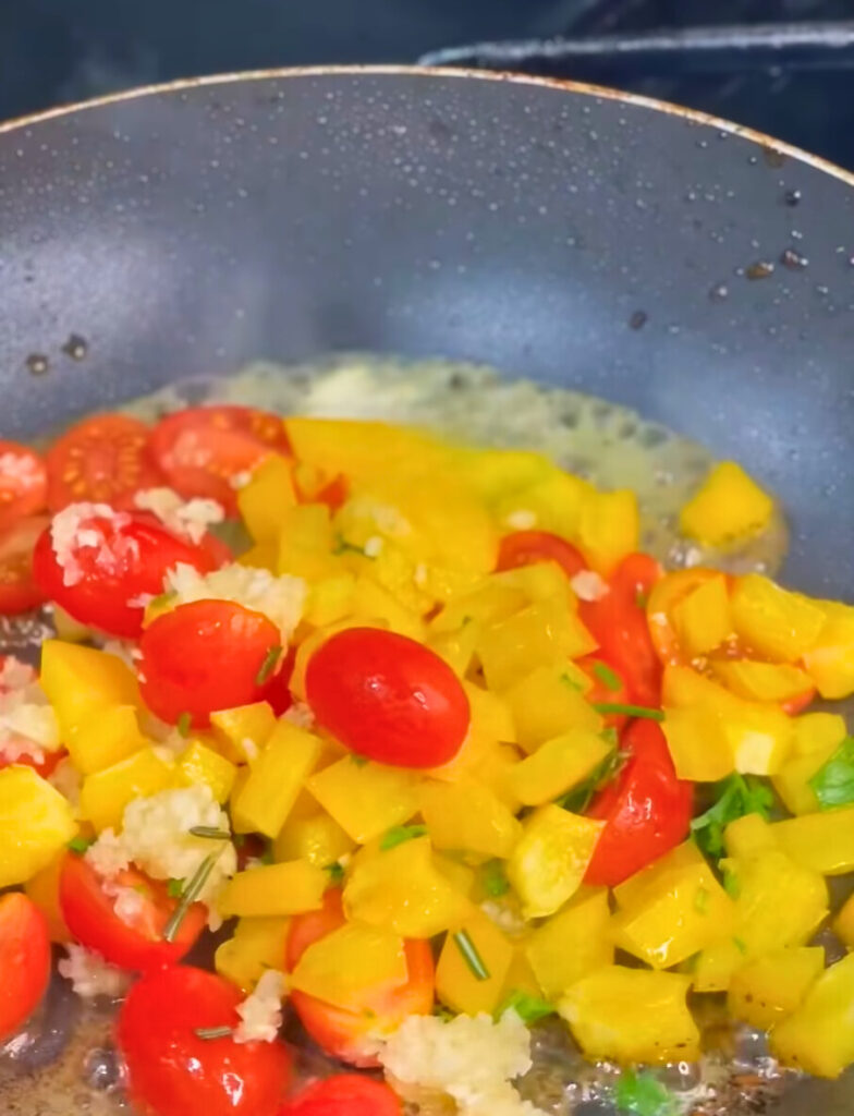 - Add cherry tomatoes, bell peppers, and garlic. Sauté for 3–4 minutes until softened and fragrant.