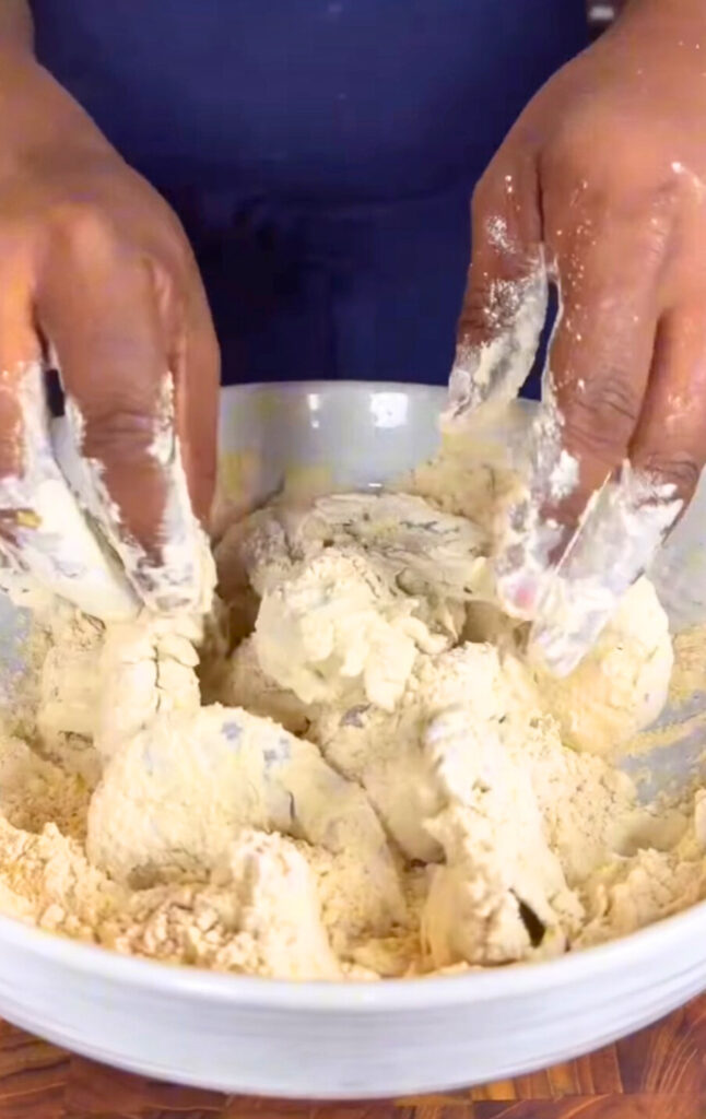 - Add half of the seasoning blend (salt, lime pepper, Chinese five spice, red pepper flakes, turmeric, sugar) to the flour mixture.