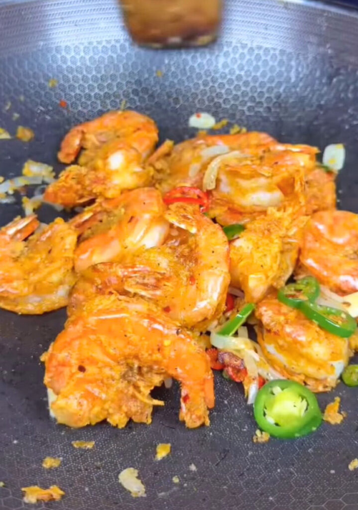 - Add the fried shrimp to the pan and toss to coat.