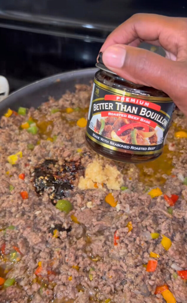 - Stir in 1 tablespoon of Better Than Bouillon Roasted Beef Base and 1–2 tablespoons of browning sauce, mixing well to coat the sausage and vegetables in rich flavor.