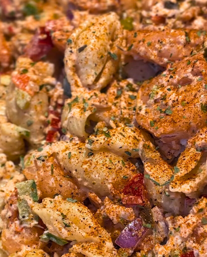This creamy seafood salad is a coastal classic with bold flavor and real texture—featuring salmon, jumbo shrimp, and lump crab tossed in a creamy, seasoned dressing. Tossed with shell pasta and bright bell peppers, it’s the kind of dish that’s equally perfect for cookouts, weeknight dinners, or Sunday meal prep.