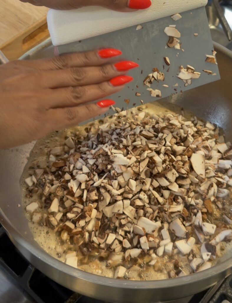 Add the diced mushrooms to the butter and let them sweat down. Stir occasionally and let them release all their juices.