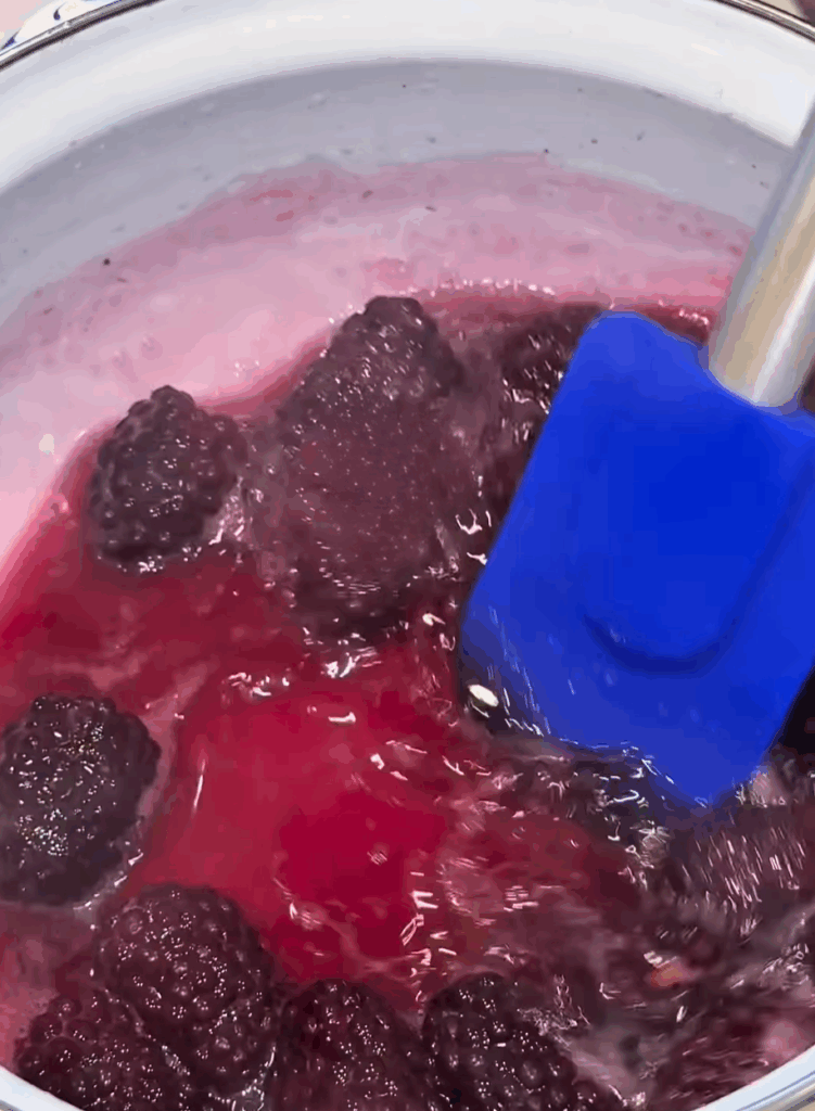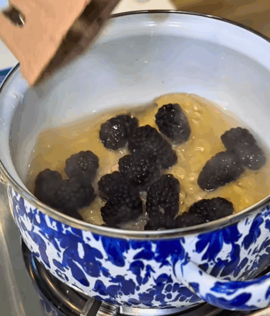 Add 1 cup fresh blackberries. Simmer 8–10 minutes, stirring occasionally, until the berries soften and release their juices.