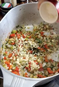 Add the chopped onion, bell pepper, and celery to the pot. Sauté until softened and aromatic, about 5-7 minutes.